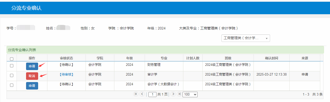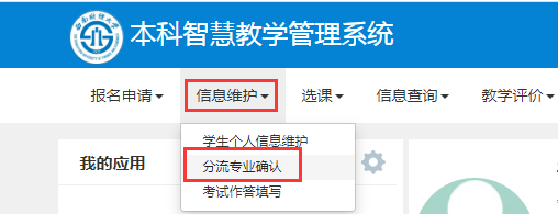 通过统一身份认证登录本科新教务系统,进入“信息维护—分流专业确认”栏目,点击相应专业的“申请”按钮即可。如想更改报名专业,也可点击“取消”按钮之后,再“申请”其他专业。